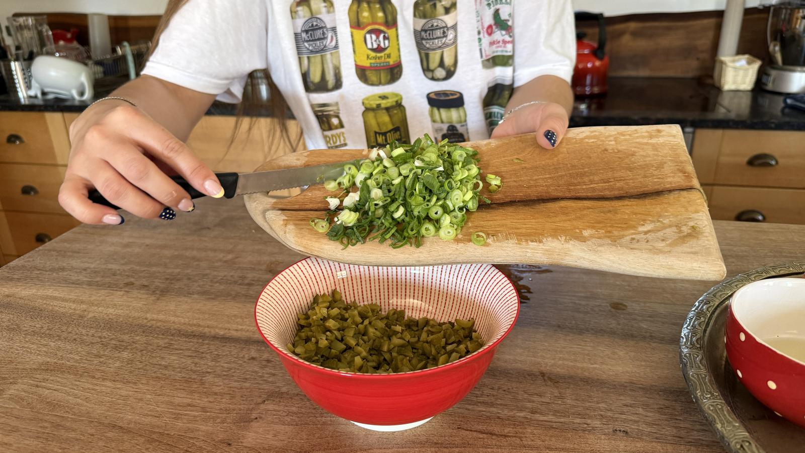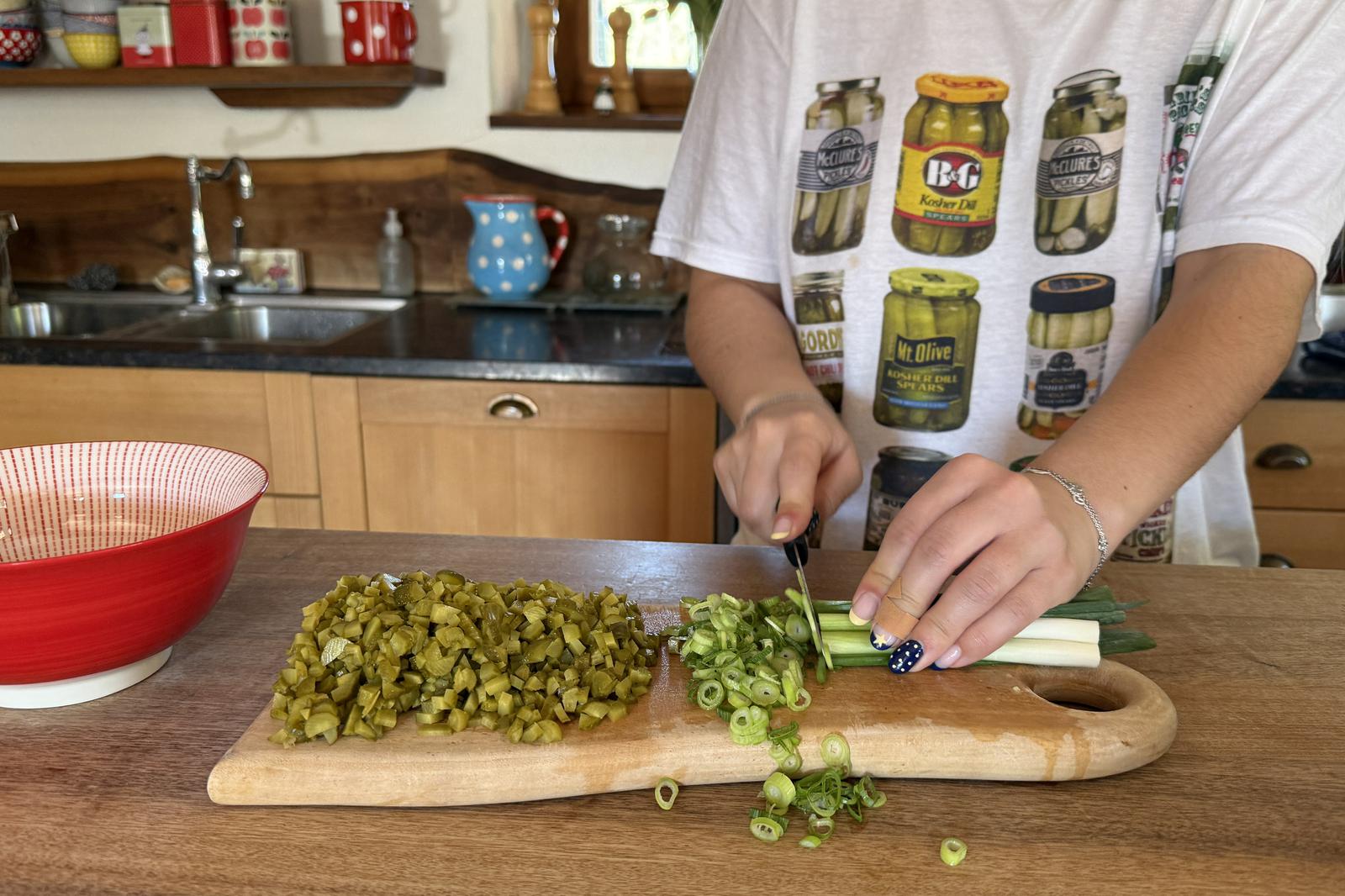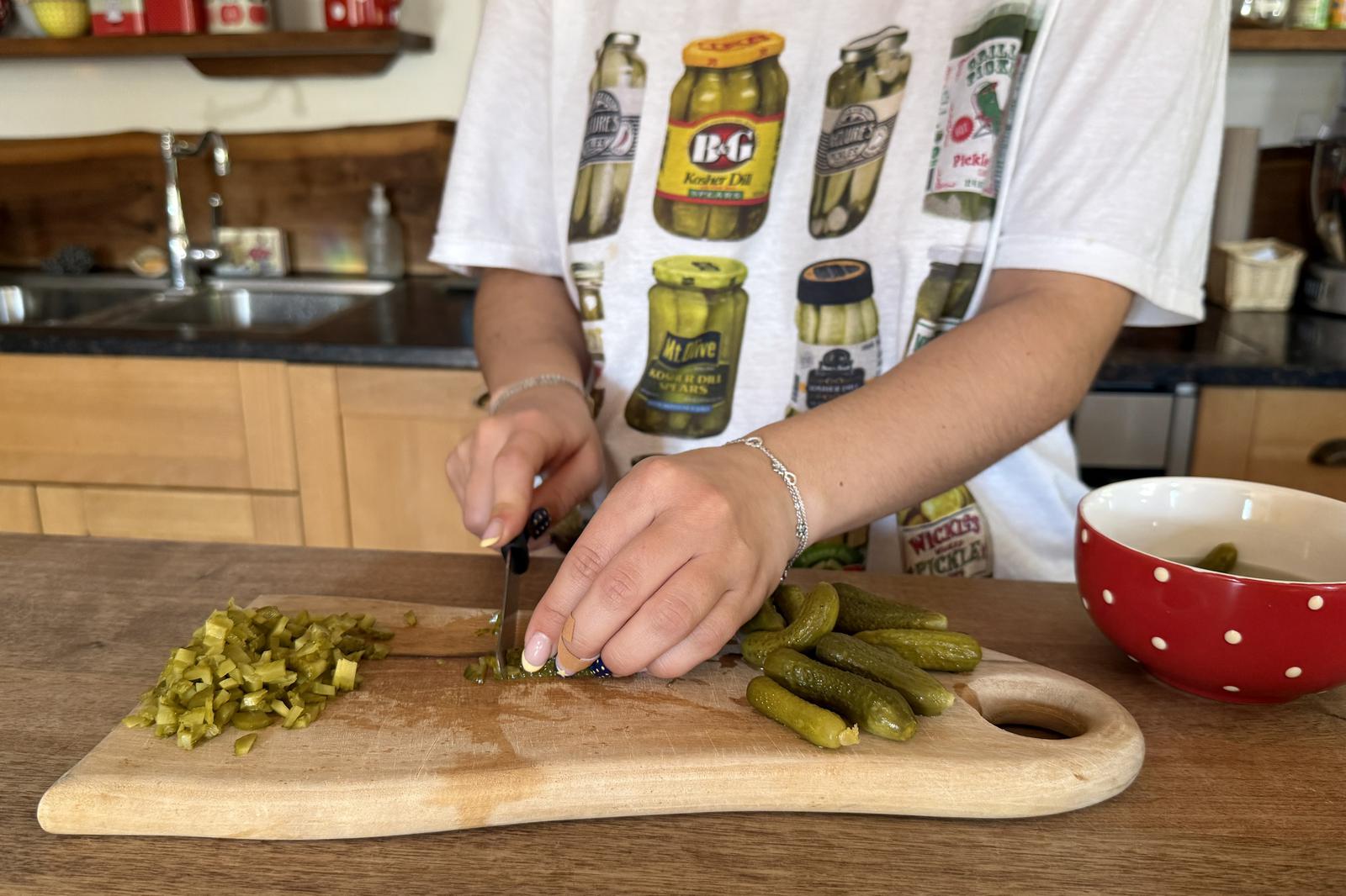 Als erstes werden die sauren Gurken kleingeschnitten: je feiner, desto besser!
