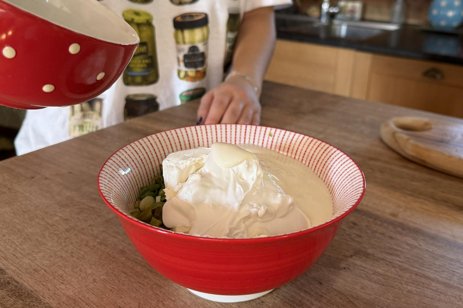 Darauf kommen die abgewogenen Zutaten: Creme Vega, Sojajoghurt, veganer Frischkäse und vegane Majonaise.
